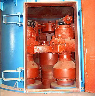 工作時,將需要粉碎的物料從機罩殼側(cè)面的進(jìn)料斗加入機內(nèi),依靠懸掛在主機梅花架上的磨輥裝置,繞著垂直軸線公轉(zhuǎn),同時本身自轉(zhuǎn),由于旋轉(zhuǎn)時離心力的作用,磨輥向外擺動,緊壓于磨環(huán),使鏟刀鏟起物料送到磨輥與磨環(huán)之間,因磨輥的滾動碾壓而達(dá)到粉碎物料的目的。